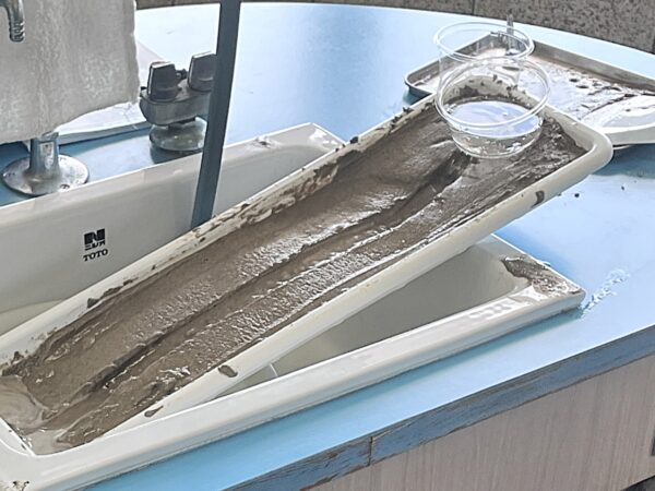 つぶの大きさが違う数種類の土を混ぜて地面を再現したトレイに、水が流れる道すじをつけて水を流します。