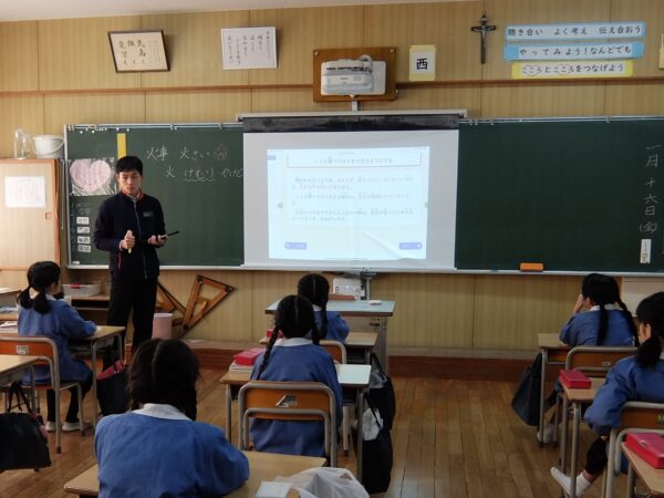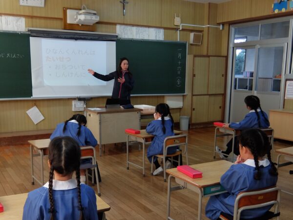 震災のとき全焼した聖堂、焼け野原に残っていた奇跡のキリスト像、ボランティアの拠点として復興のために力を尽くされたことなど、心のこもった発表をみんな真剣にきいていました。そして、震災の悲しみの中、神戸の小学校で生まれた希望の歌「しあわせはこべるように」を歌いました。