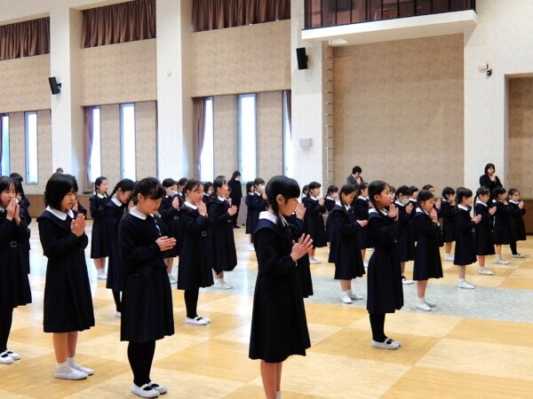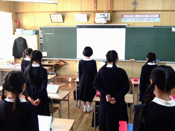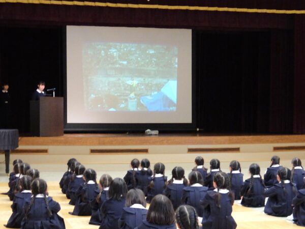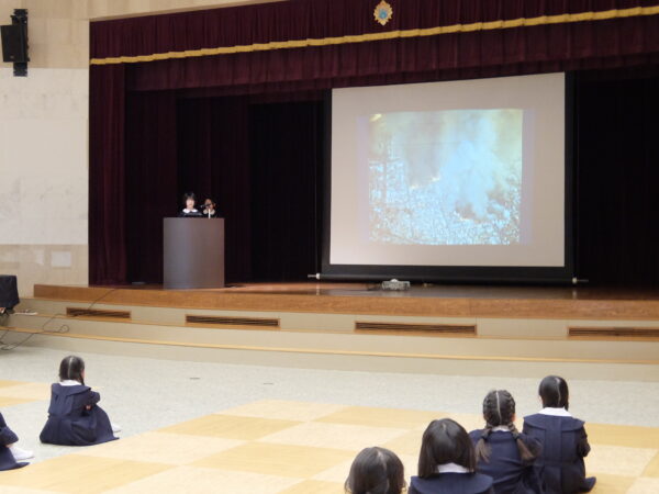 犠牲者の方々への黙とうを捧げたあと、5年生がカトリックたかとり教会を訪問し、神田神父様からいただいたお話を全校生に伝えました。