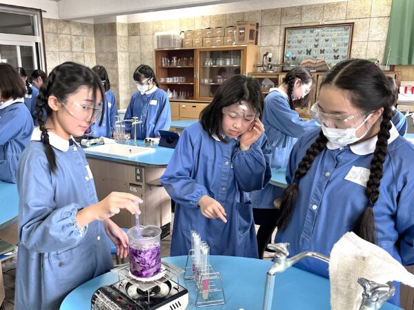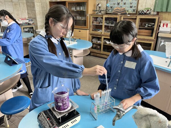 それを沸騰したお湯の中へ。みるみる色が抜けていきます。しばらく冷ましてできた紫色の液体を、これまで調べてきた水溶液に入れてみます。