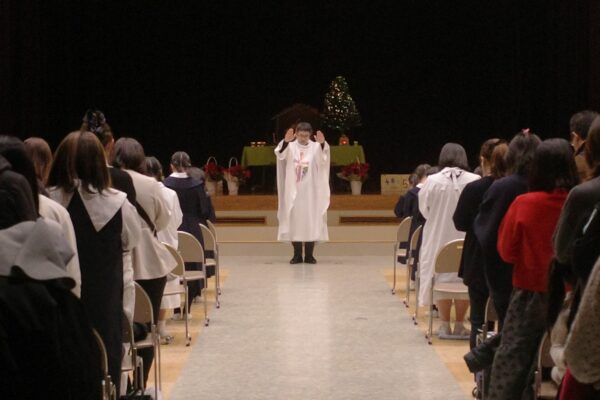 いよいよクリスマス会がスタート。6年生による「しずけき」の美しいリコーダー奏で、幼子のイエスさまが神父さまに抱かれて入場しました。