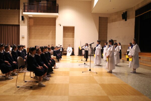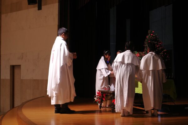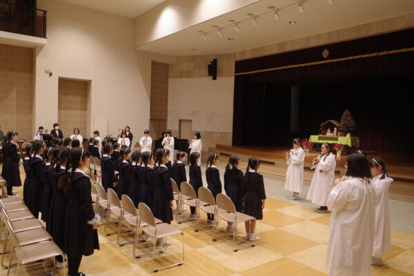 いよいよクリスマス会がスタート。6年生による「しずけき」の美しいリコーダー奏で、幼子のイエスさまが神父さまに抱かれて入場しました。